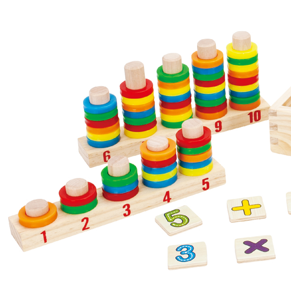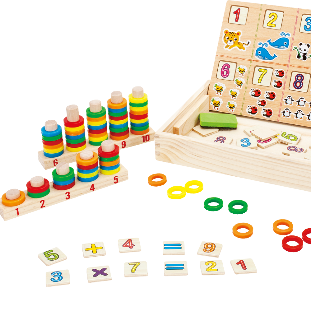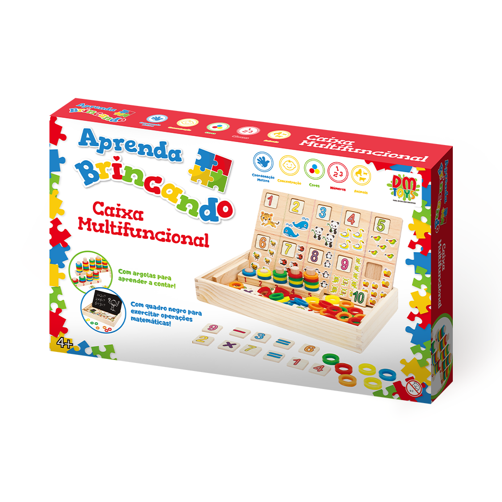 A Caixa Multifuncional Aprenda Brincando DM Toys é um centro de atividades em madeira projetado para o aprendizado lúdico de matemática e contagem para crianças a partir de 4 anos. Este brinquedo educativo estimula o raciocínio lógico e a coordenação motora com diversas ferramentas: as argolas coloridas e pinos ajudam na associação de números e quantidades, enquanto as peças de encaixe introduzem o reconhecimento de números e símbolos matemáticos.