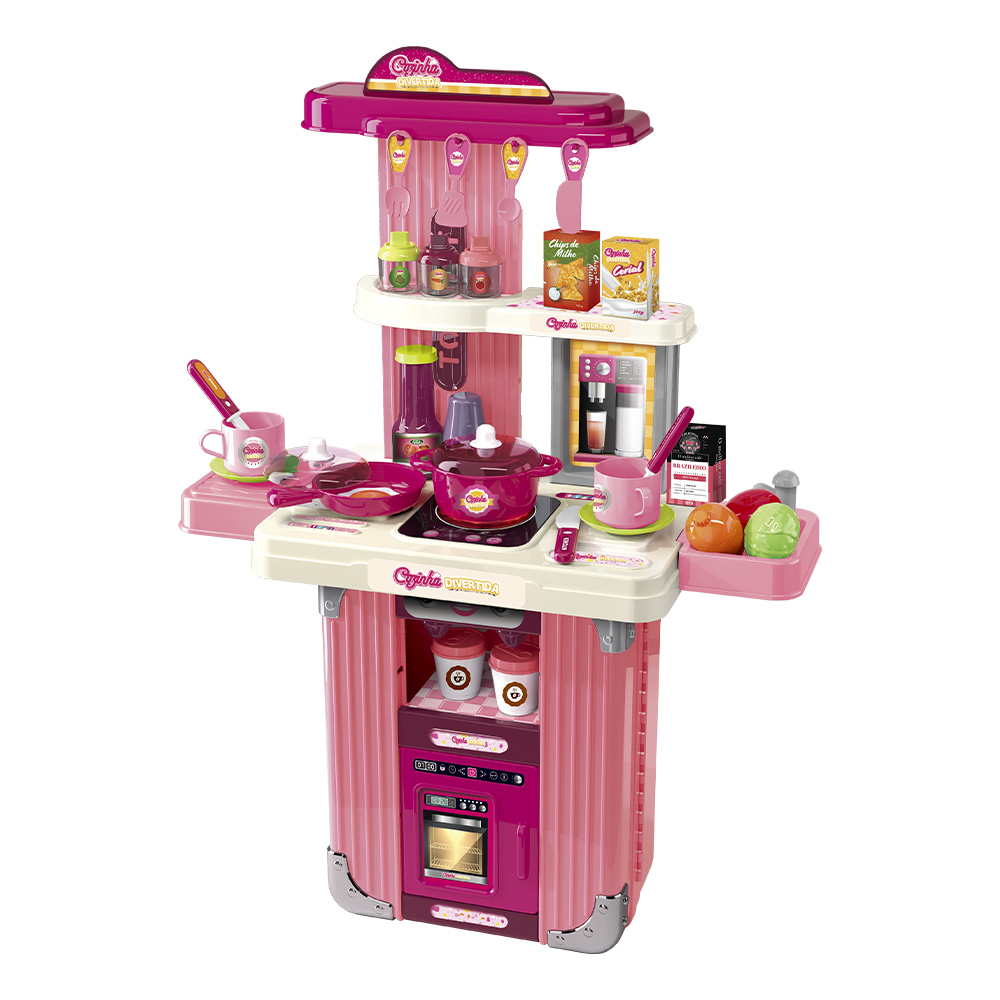 Maleta Cozinha Divertida Plus Uma cozinha completa dentro de uma maleta! Este modelo interativo possui um fogão especial: aperte o botão e veja a luz acender! Conta também com um forninho com porta que abre de verdade e diversos acessórios, como panelinhas e talheres. Perfeito para crianças a partir de 3 anos que amam brincar de chef em qualquer lugar.