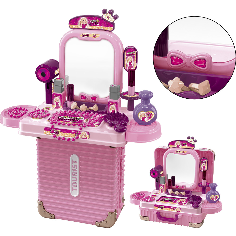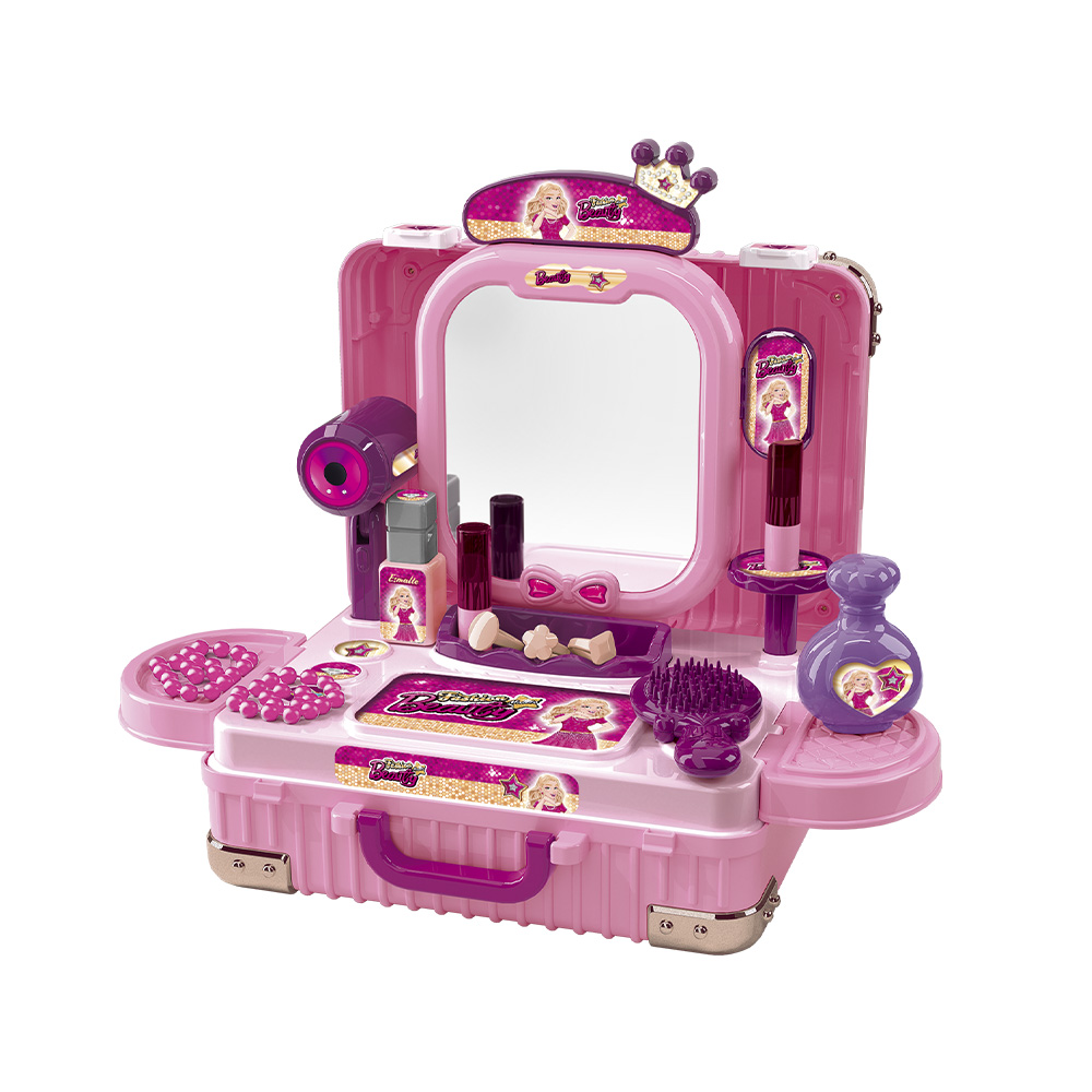 Maleta Fashion Beauty 2 em 1 – Leve o seu salão de beleza para onde for! Esta maleta incrível se abre e vira uma penteadeira fashion com espelho e tudo o que você precisa para se arrumar. Acompanha secador, escova, perfumes e vários acessórios de moda, como colares e anéis. Perfeita para estimular a autoestima e a imaginação das crianças a partir de 3 anos.